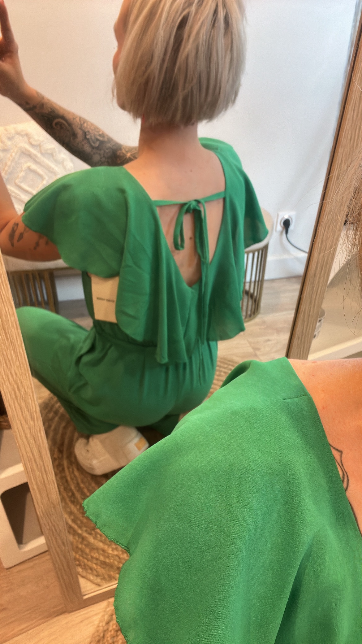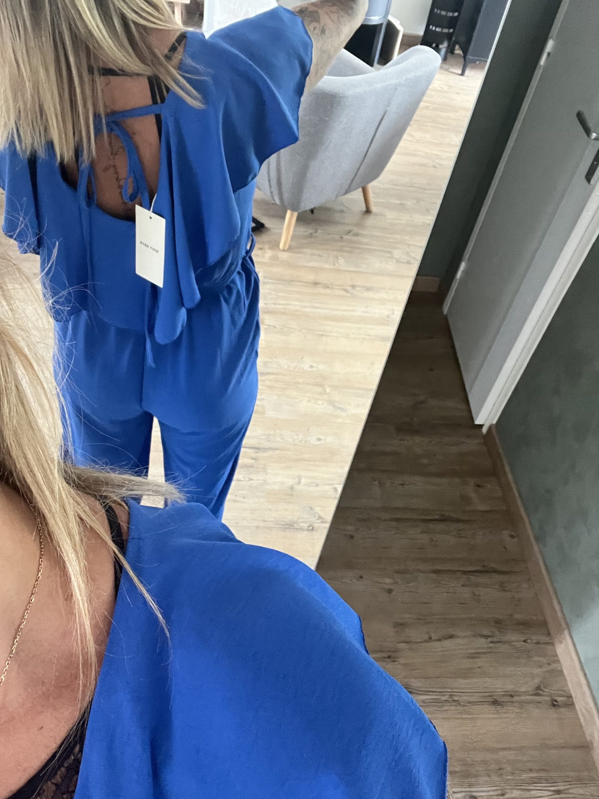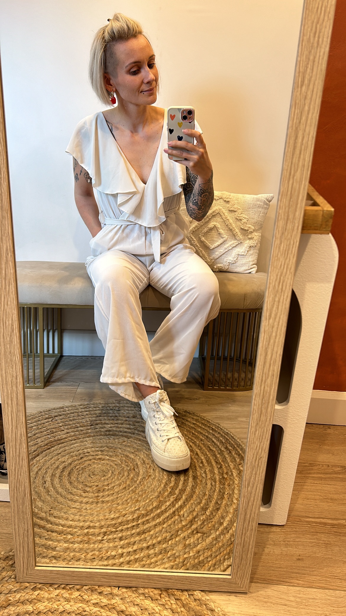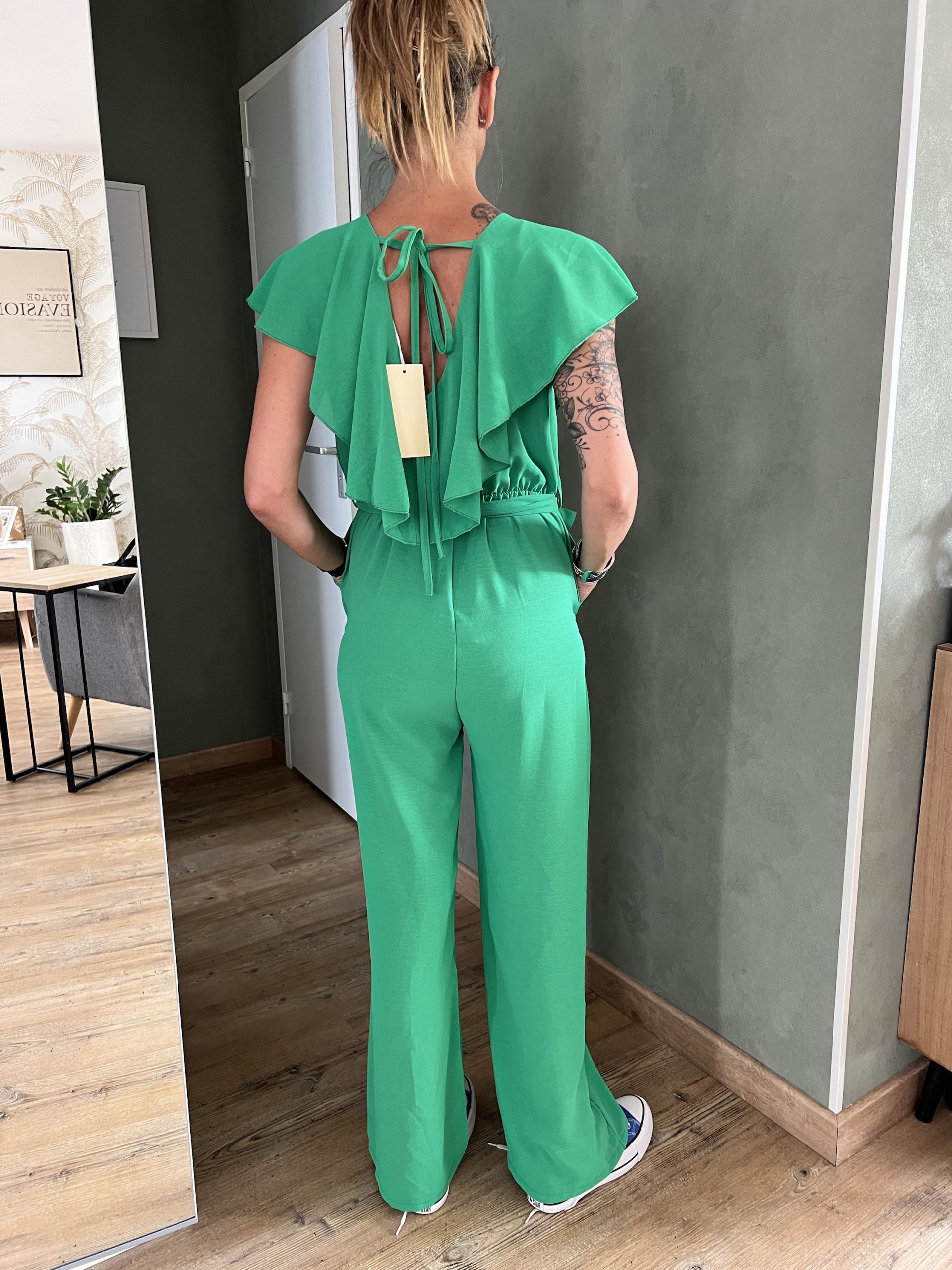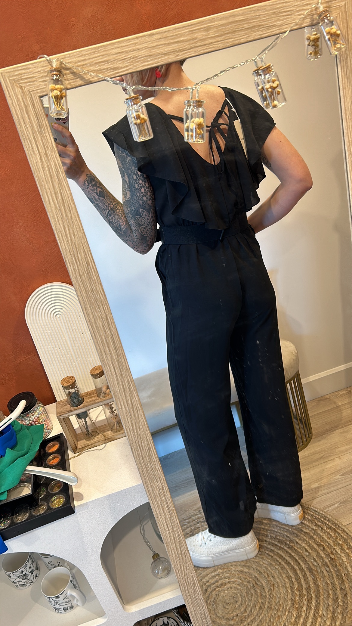 Combinaison taille élastique, lien à nouer à la taille (peut être remplacé par une ceinture). Détails dans le dos et très agréable à porter. Taille unique allant du 36 au 42, plusieurs coloris disponibles.
