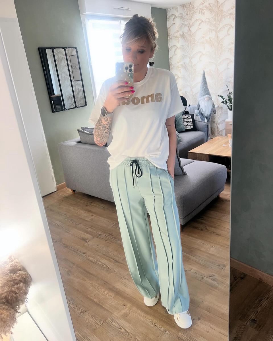 Pantalon large vert d’eau avec pinces, lien de serrage à la taille. Taille unique du 36 au 42